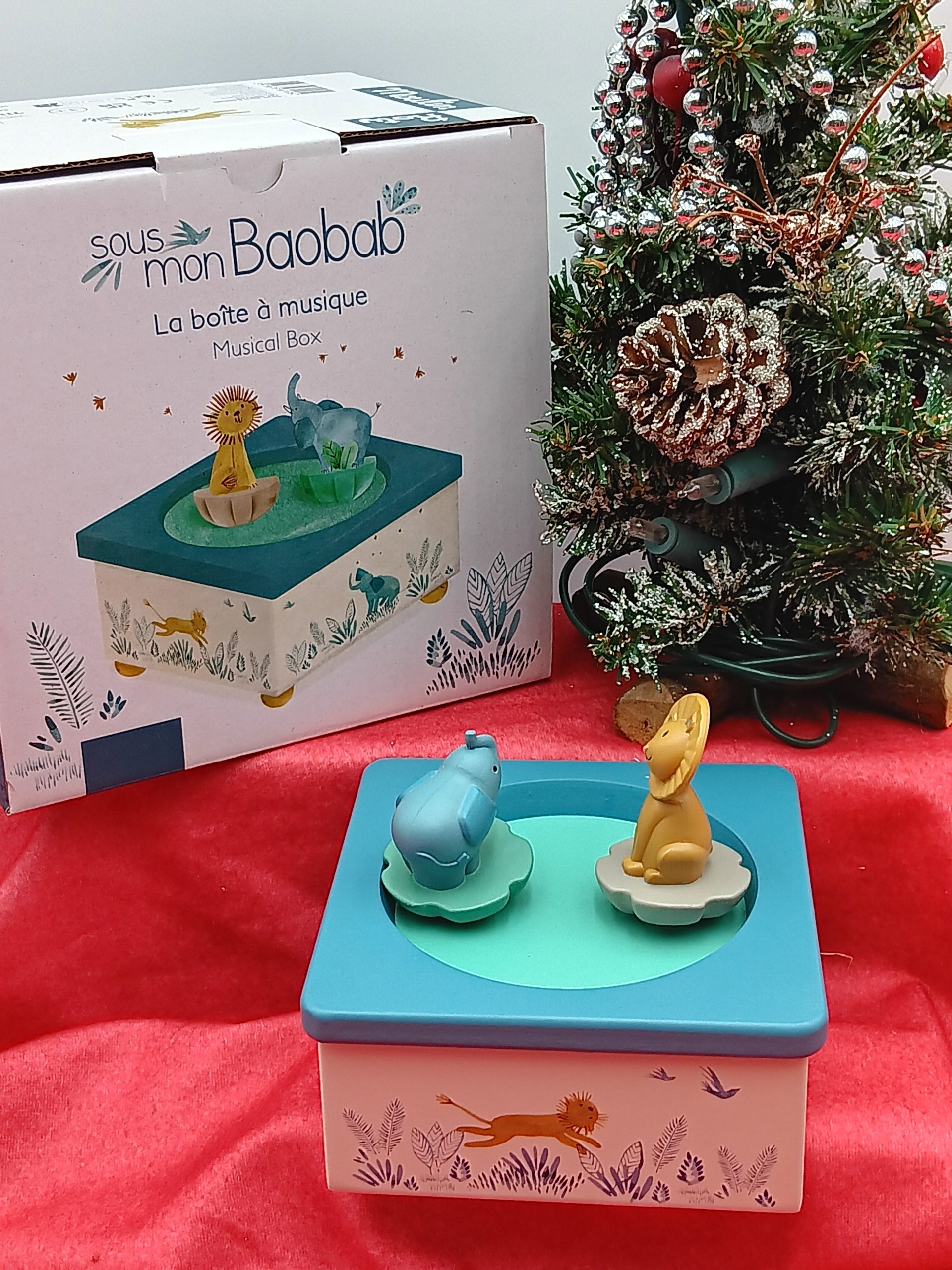 Cette jolie boîte à musique aux couleurs douces fait tourner un lion et un éléphant au son d’une douce mélodie.